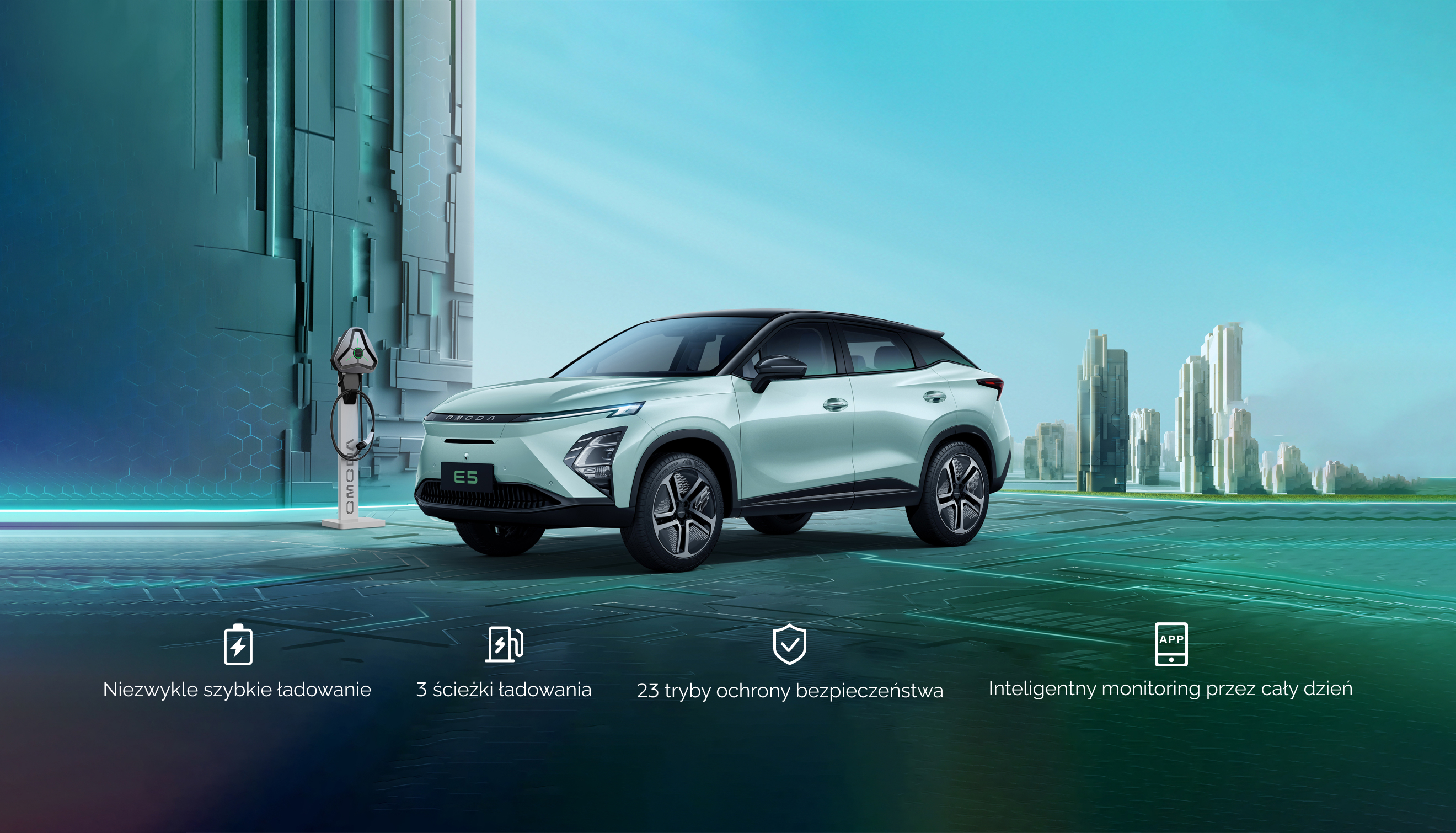 Omoda E5 wykorzystuje akumulator litowo-żelazowo-fosforanowy odporny na wysokie temperatury, oferujący większe bezpieczeństwo i stabilność oraz dłuższą żywotność.